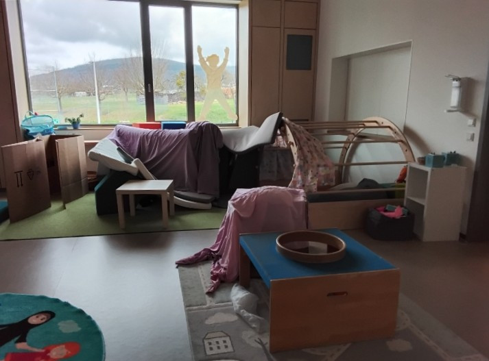 Der Raum dient nach dem Mittagessen als Ruheraum. Die Kinder werden von einer/einem Pädagogen/Pädagogin begleitet. Kinder, die einschlafen, können liegen bleiben. Kinder, die nicht einschlafen, genießen die ruhige Atmosphäre und stehen nach dreißig Minuten wieder auf.